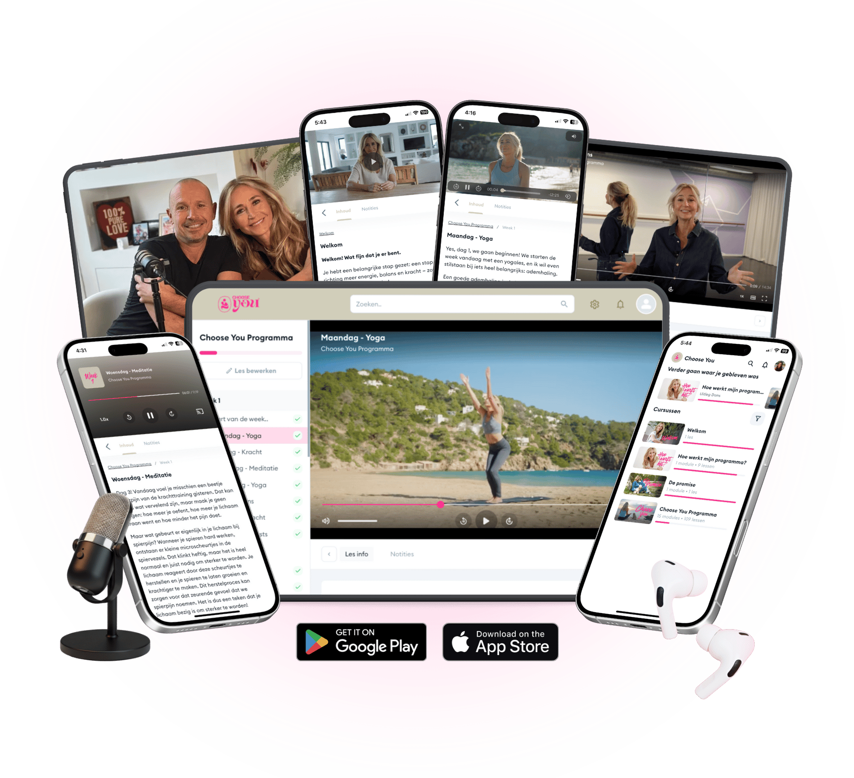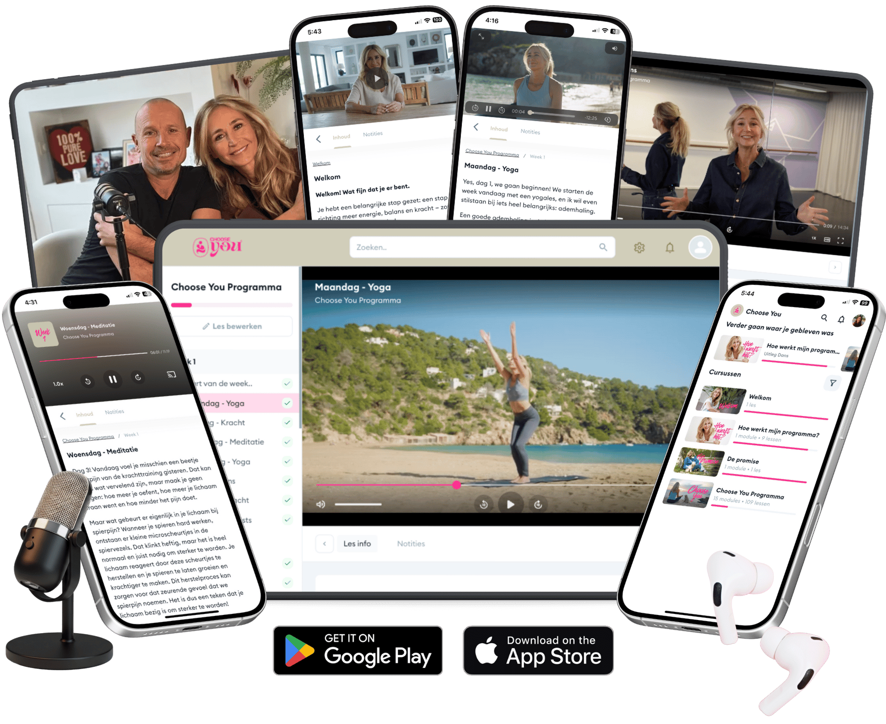 Choose You duurt 12 weken, maar je krijgt 24/7 toegang tot het volledige programma. Alle video’s, podcasts, trainingen en meditaties blijven voor je beschikbaar, zodat je alles zo vaak kunt terugkijken en beluisteren als je wilt, op jouw moment, in jouw tempo.