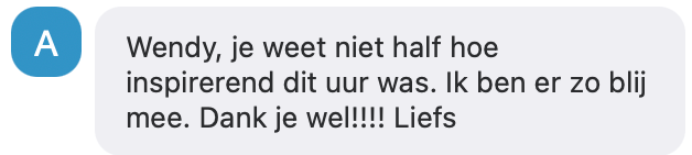 "Wendy is een prachtige en oprechte inspiratiebron, zo innemend en liefdevol voor iedereen. Door haar durfde ik een belangrijke stap in mijn leven te zetten waarvoor ik haar nog steeds dankbaar ben."